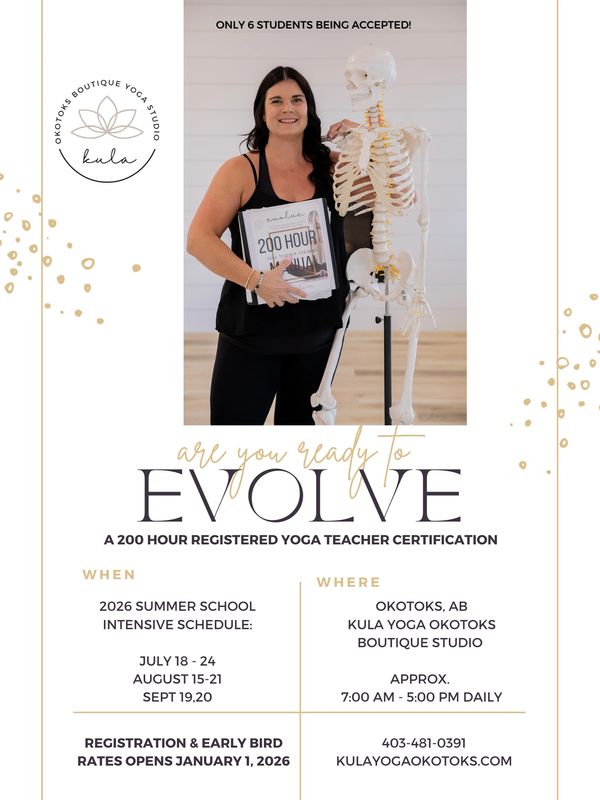 EVOLVE begins on July 18, 2026 in Kula Yoga's beautiful boutique yoga studio in Okotoks, Ab. Training is SEMI PRIVATE